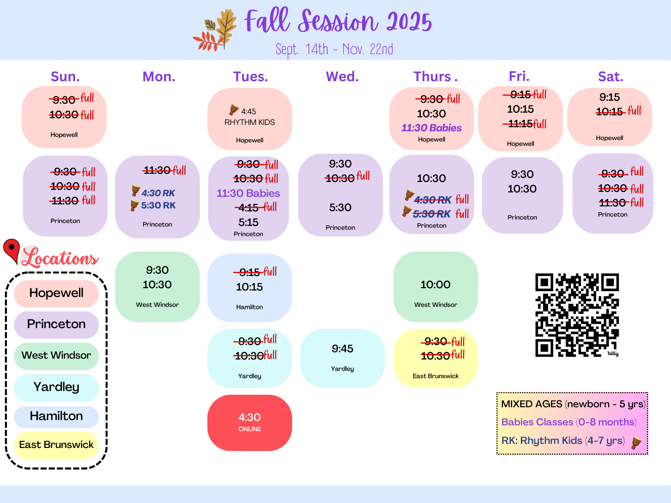We offer Babies Classes (for non-mobile infants), Mixed Ages Classes (for children 0 - 5), and Rhythm Kids® (for big kids 4 - 7 years).